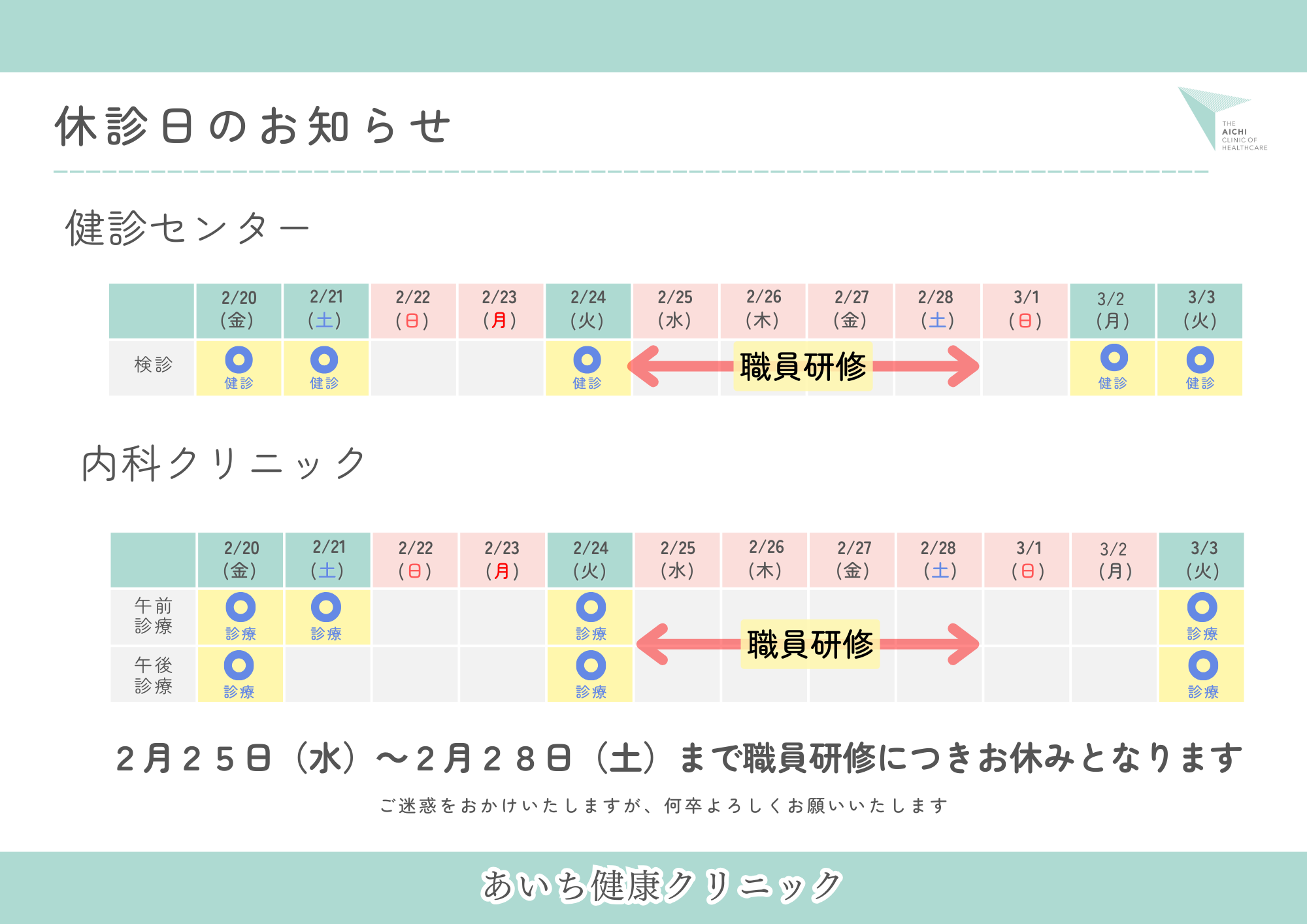 健診センター内科クリニック 休診のお知らせ:2026年2月25日から2月28日まで 2026-01-28 職員研修のため、2026年2月25日(水)から2月28日(土)までの間、内科クリニック・健診センターともに休診とさせていただきます。 ご不便をおかけいたしますが、よろしくお願いいたします。 なお、急な体調変化で他院受診される場合は、お薬手帳や最新の検査結果をお持ちいただくようお願いいたします。 投稿ナビゲーション <1/23(金)・1/24(土)の診療について